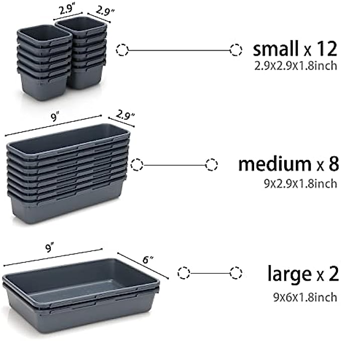 • Customize Combination - 22 pack flexible small drawer organizer with 3 various sizes allow for a good variety of layout. Items are organized according to size and use. contains 12pcs Small:(2.9×2.9×1.8 inch) - 7.5×7.5×4.5 cm,8pcs Medium:(9×2.9×1.8 inch)- 23.5×7.5×4.5cm,2pcs Large:(9×6×1.8 inch)-23.5×15.5×4.5cm.