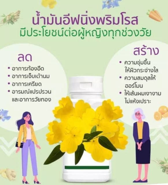 ⏩ผลิตภัณฑ์เสริมอาหารที่ประกอบด้วยส่วนผสมของน้ำมันอีฟนิง พริมโรส และน้ำมันโบราจ ที่ให้กรดแกมมาไลโนเลนิก ขิงผงเข้มข้น สารสกัดจากตังกุย รวมทั้งมีส่วนผสมของซิตรัส ไบโอฟลาโวนอยด์เข้มข้น และเบต้าแคโรทีนจากธรรมชาติ ซึ่งให้สารไฟโตนิวเทรียนท์จากธรรมชาติ