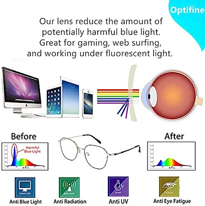 • ? VERSATILE USE -- Designed for all-day wear. Optifine blue light blocking glasses are perfect for individuals who need to look at smartphone or computer monitors all day like office workers, tech engineers, and hardcore gamers