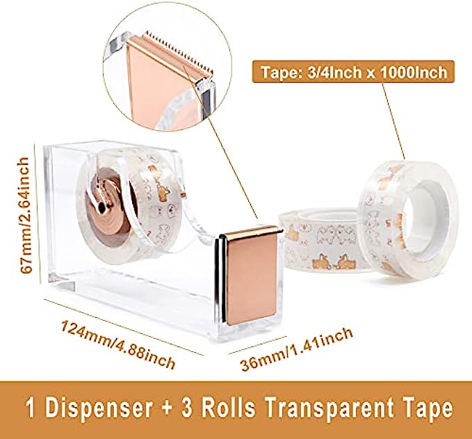 【Specification】 the gold stapler size:6.14 x 1.41x 2.56 inch; Tape dispenser size:4.88 x 1.41 x 2.64 inch; Staple Remover size is 2.36x 0.61x 1.57inch; Binder Clips szie is 0.75x 0.35inch; Pencil Holder size is 3.15x 3.86inch, all rose gold rose gold tape dispenser and stapler are regular size for office desk use.
