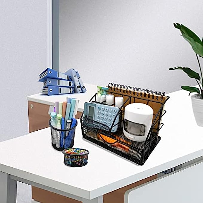 Caicvanlo Desk Organizers Office Supplies Set with 7 Compartments + 3 Accessories Mesh Desk Organizer Caddy with Drawer + Pen Holder,Paper Clip Holder,Business Card Holder for Office,Home,Art,File