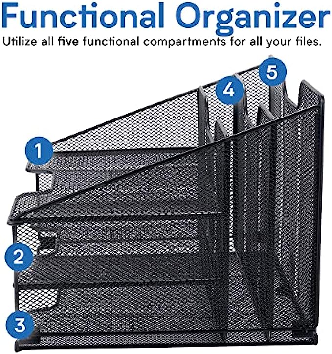 Halter Mesh Desk Organizer for Office Supplies Organization - 5 Compartments - 3 Letter Tray and 2 Vertical Upright Folder Holder - Ideal Paper Sorter and File Organizer for Home or Office - Black