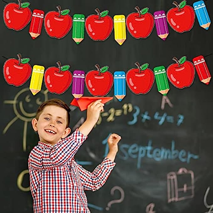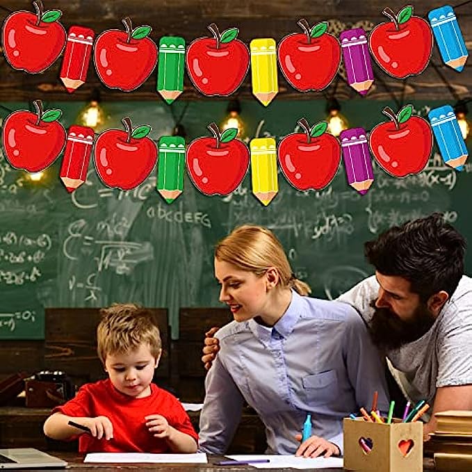 • ✏️The Pencil and Apple Garland, With its unique graphic design and bright and fashionable appearance, these banner are used as the decoration of the back to school party, which can immediately attract everyone's attention at home or in the student supplies office. Are you still looking for unique and perfect family party decoration? This banner of apple and pencil is like a rainbow, making your welcome ceremony different!
