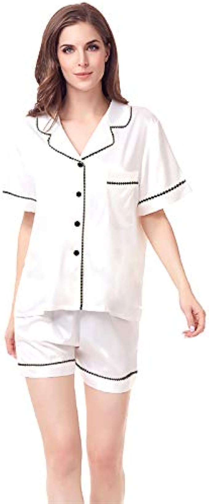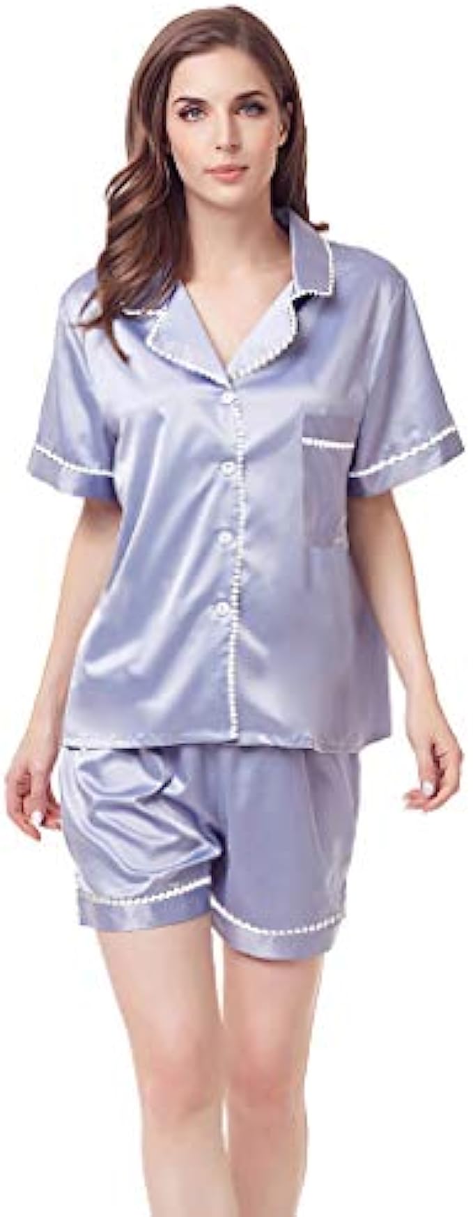 98% Polyester, 2% Other Fibers Button closure Hand Wash Only Material: Pajama set using premium 98% polyester, 2% spandex and plain matte satin material, feel very soft and silky, breathable, skin-friendly, so you have a restful sleep. Product Features: Loose fit, comfortable pajamas two-piece set Loose fit, comfortable two-piece pajama pajamas set with the silkiest elastic waist pants, elegant collar design, chest pockets, and flared buttons with contrast lace piping. The pajama set is soft and elegant, giving you a lazy sleep. Applicable Occasions: Women's short-sleeved silk satin pajama set, suitable for daily wear and easy to match. Light weight and easy to carry. Comfortable, suitable for rest and sleep, slumber party, girls' day, bridal pajamas, indoor, living room, bedroom, hotel, workplace, travel, daily pajamas. Cleaning instructions: The pajamas set is soft, not prevent the surface of the wrinkles affect the beauty, hand wash separately in cold water is recommended. Cool ironing on reverse side. Do not spin dry! Gift: Women's plain matte satin pajamas are made of high quality fabric with nice lace, soft and natural with luster. Perfect for your wife, girlfriend, mother, sister and daughter as a birthday gift, as well as for New Year, Valentine's Day, Christmas, bridal party gifts, honeymoon holidays or other holidays or anniversaries.