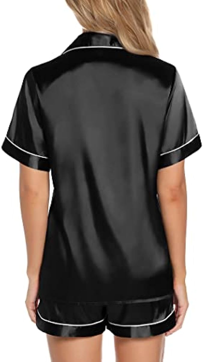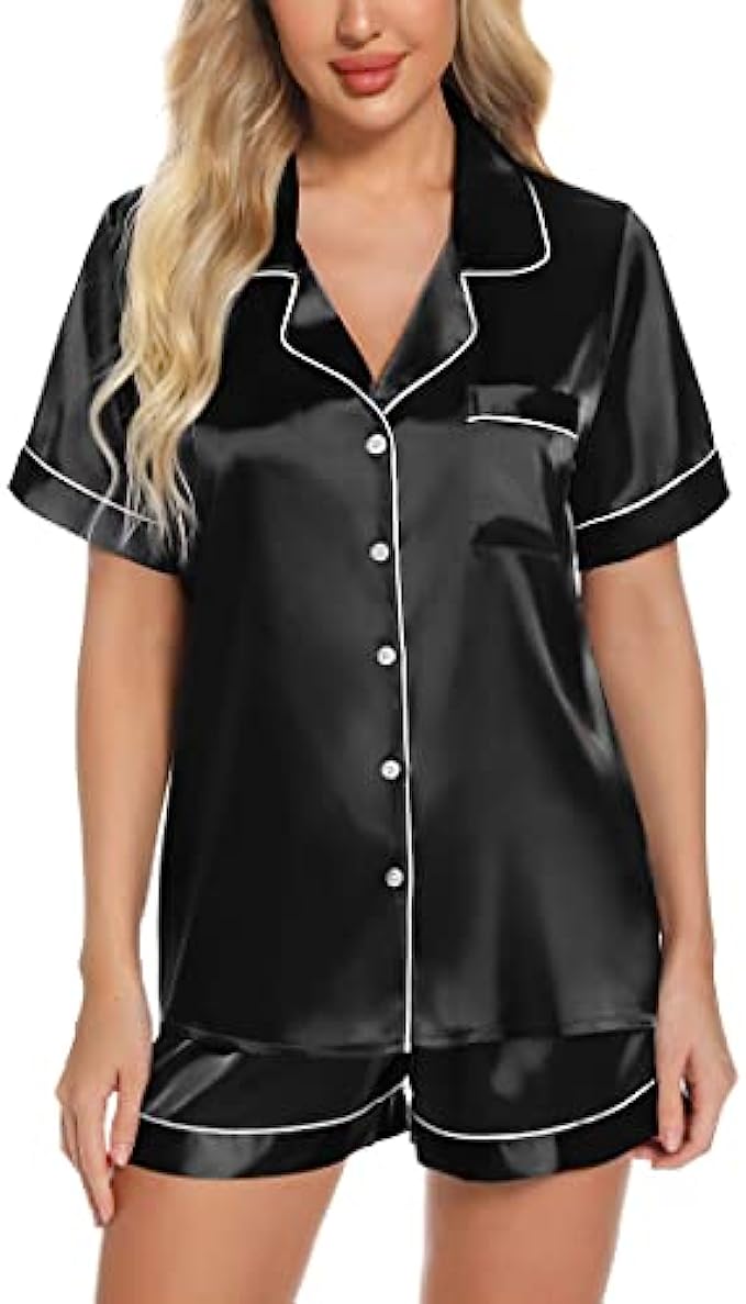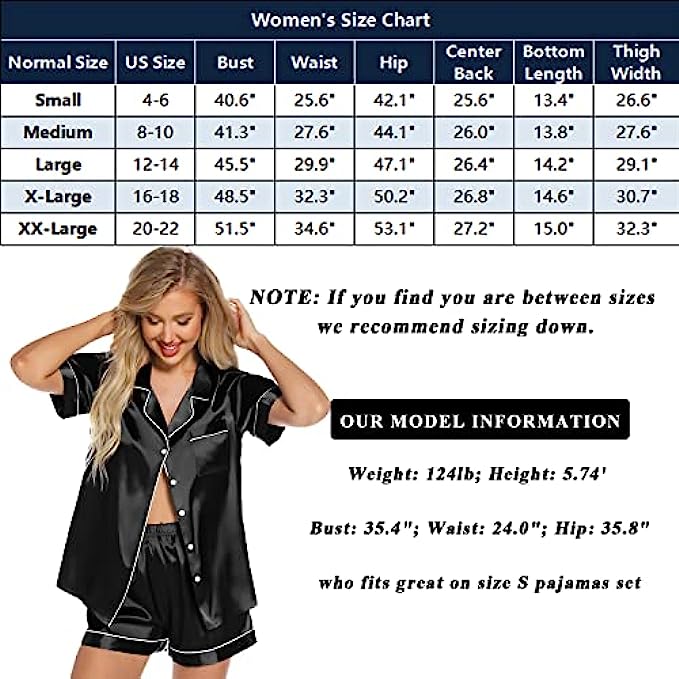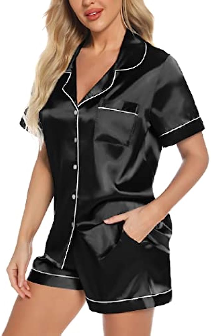 Brand name: Anjue satin silk pajamas set Materials: Silk satin material, 96% polyester, 4% other fibers; improted Designs: Exquisite piping & Chest Pocket & Shorts Pockets & Turn down collar & Elastic Waist and button closure Washing Tips: Machine Washable, hand washed suggestion. Great for sleeping, casual wear or lounging around the house or yard all day. ❤【SILKY SATIN SLEEPWEAR】Smoother, better and soft to the touch and easy on the skin. Anjue silk satin pj set is made from comfy silk satin, soft, breathable and skin-friendly materials, making relaxing as comfort as possible. Perfect for sleepwear, nightwear or loungewear. ❤【BUTTON FRONT PAJAMAS TOPS】Short sleeve satin sleepwear with FULL BUTTON FRONT PAJAMA tops hits at hip, chest pocket with notch collar short pj sets. This silk pajama top is easy to get on and off, making it perfect for nursing your newborn at home. ❤【ELASTIC WAIST】Two side pockets have been new added to theses satin pajamas shorts. Elastic waist that fits for any body size and makes relaxing as comfort as possible. Excellent silk pajamas set for lounging, sleeping, nursing, travel, spa, bridal shower, etc.
