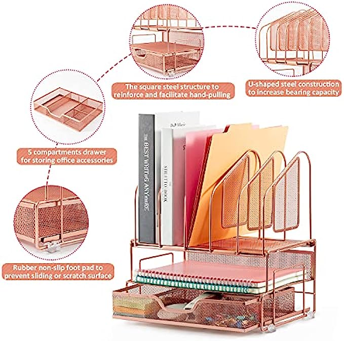 LARGE CAPACITY AND STABLE: rose gold desk organizer is eye-catching and attrac attention, which made of steel, it is more stable than normal desk organization. It is convenient to arrange documents, paper, file, folder in one place for quick and easy access