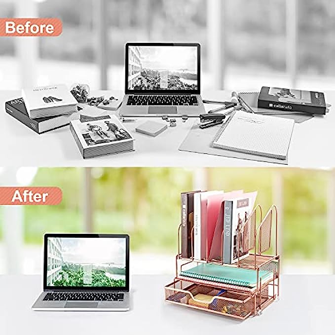 LARGE CAPACITY AND STABLE: rose gold desk organizer is eye-catching and attrac attention, which made of steel, it is more stable than normal desk organization. It is convenient to arrange documents, paper, file, folder in one place for quick and easy access