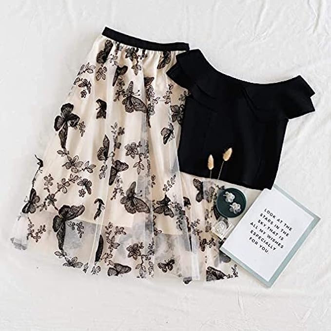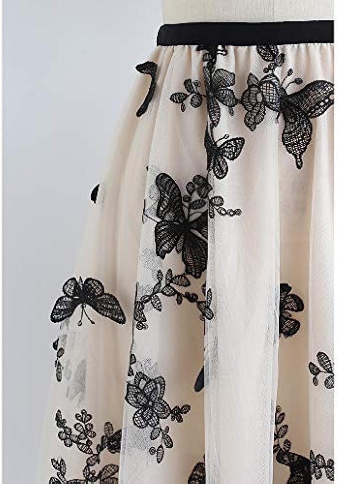 • [ Style Details ] This romantic skirt is giving us all the feels. Featuring the mesh tulle overlay with lining that skims your body, super cute 3D mesh rose trimming and elastic waistband. Dress it up with heels and gold hoops. It's the perfect skirt for a perfect day.