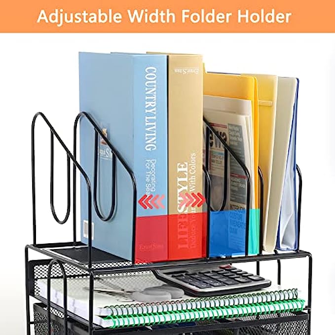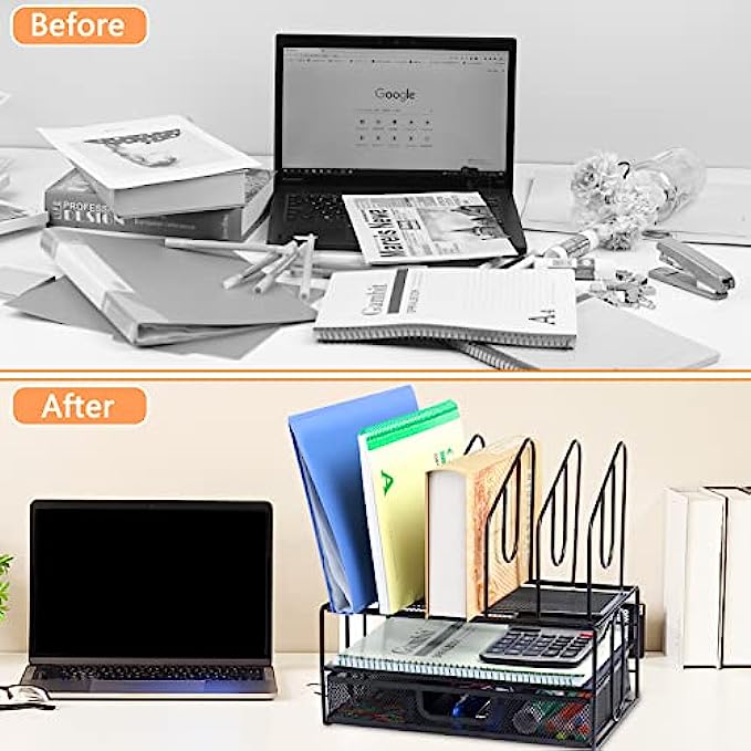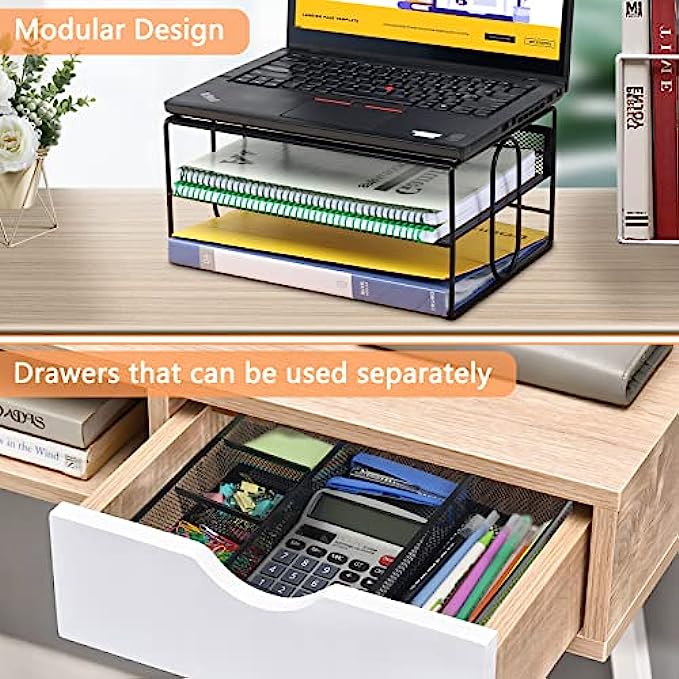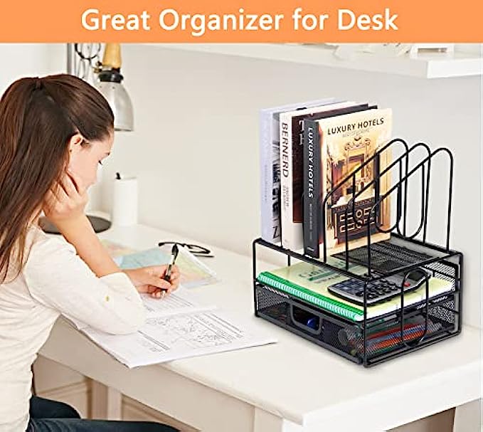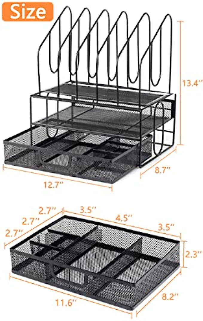 LARGER AND MORE DURABLE: Our multifunctional desk organization is made of premium steel that's durable and won't rust. It can perfectly meet your multiple storage needs and consists of 3 parts, including 3 vertical file sorters, 1 layer file tray and 5 compartments sliding drawer, suitable for holding large number of folders, paper letters, and notebooks in offices and schools (12.7"L x 8.7"W x 13.4"H)