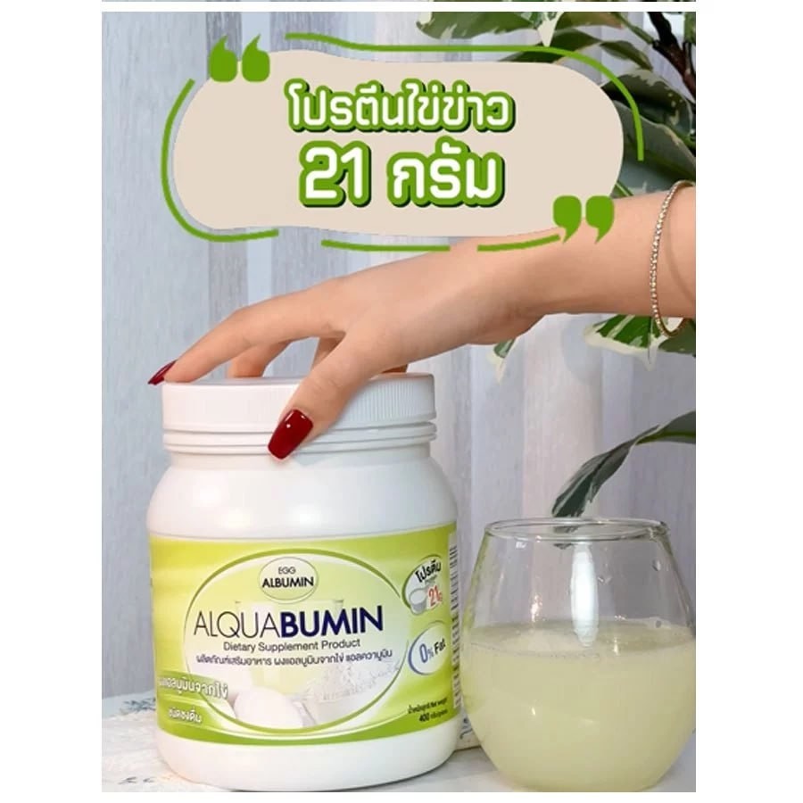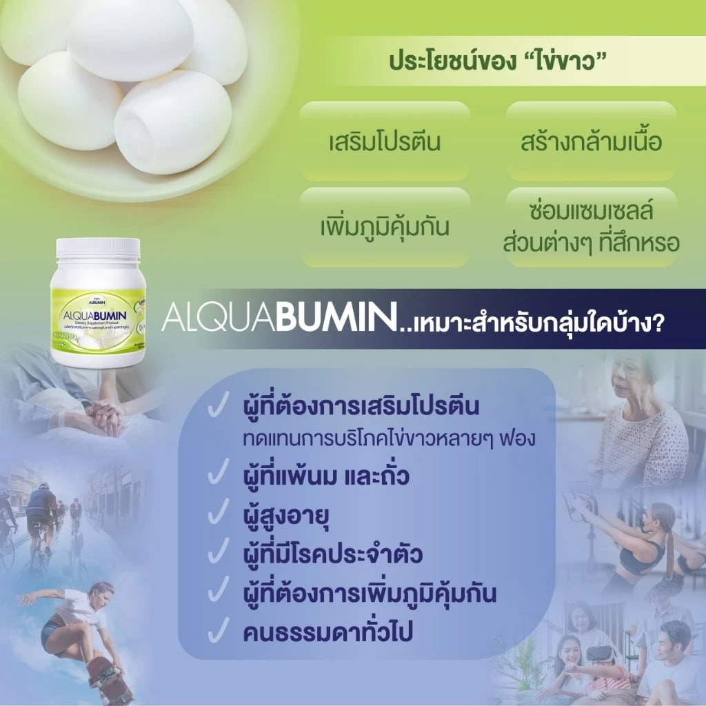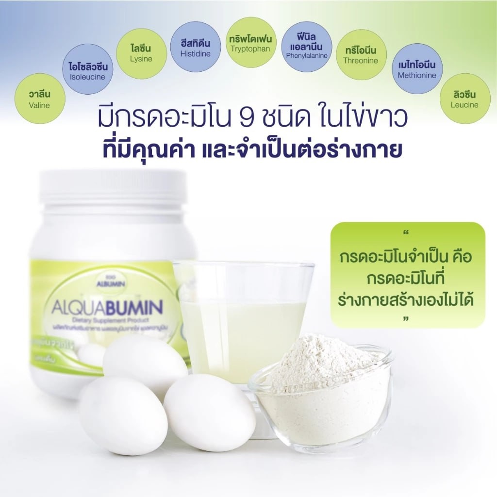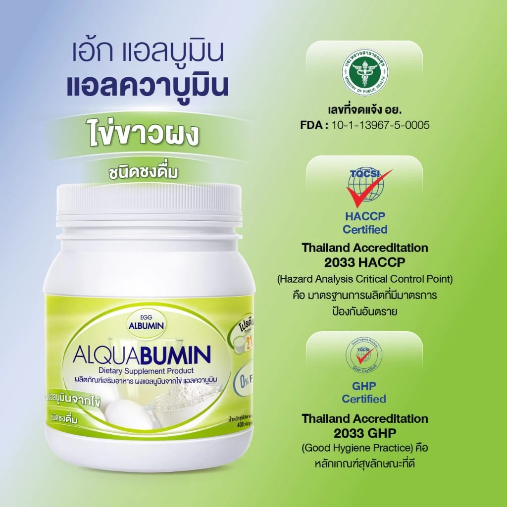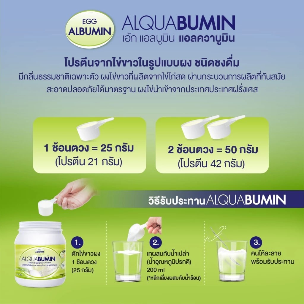 เอ้ก แลบูมิน แอลควาบูมิน (Egg Albumin ALQUABUMIN) โปรตีนจากไข่ขาวในรูปแบบผง ชนิดชงดื่ม มีกลิ่นธรรมชาติ เฉพาะตัว ละลายเร็ว ไข่ขาวผงที่ผลิตจากไข่ไก่สด ผ่านกระบวนการผลิตที่ทันสมัย สะอาด ปลอดภัย ได้มาตรฐาน ปริมาณที่แนะนำคือ ปริมาณ 25 กรัมต่อมื้อ (เทียบเท่าไข่ไก่ 8 ฟอง)