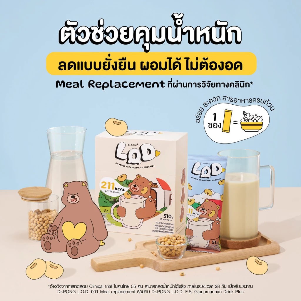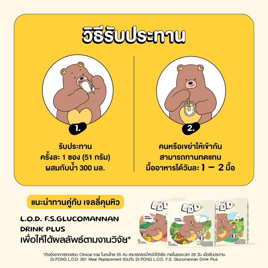 *อ้างอิงจากการทดสอบ Clinical trial ในคนไทย 55 คน สามารถลดน้ำหนักได้จริง ภายในระยะเวลา 28 วัน เมื่อรับประทาน Dr.PONG LOD 001 Meal replacement ร่วมกับ Dr.PONG LOD FS Glucomannan drink plus