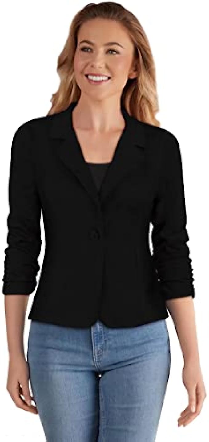 • CLASSIC DESIGN - We've designed this blazer with you in mind: professional, form-fitting and flattering. The single front button makes it easy to put on and take off. 3/4 scrunch sleeves add an extra touch of style while remaining comfortable closure