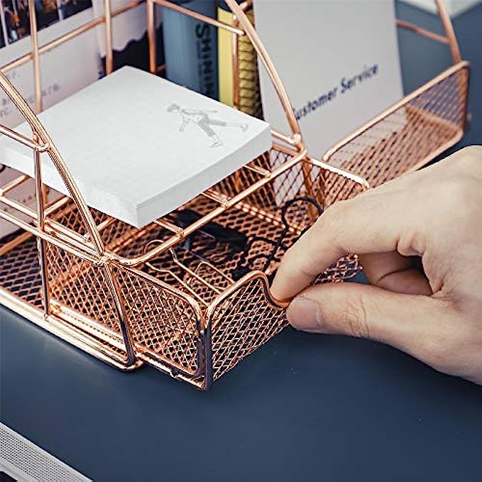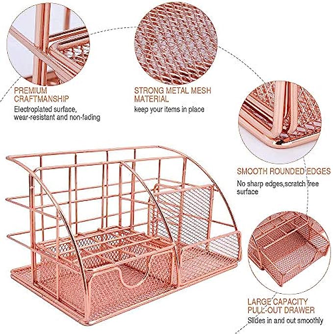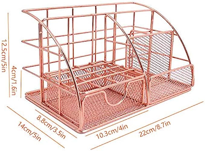 • ?【Sturdy & Durable &No Assembly】Made of upmarket iron mesh wire, the all in one desktop organizer is plated with rose gold color. It is anti-oxidation, corrosion-resistance. Its base and rim have been reinforced and will not be easily broken and bent. Mesh design make it not keep dust easily. Easier to clean and sturdier than a plastic one.After you receive the desktop organizer, you can use it directly without installing it.