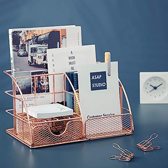 • ?【Multi-function Rose Gold Desktop Organizer】-With 5 independent compartments and one sliding drawer, the desktop organizer can be used as documents holder, pen holder and paper organizer. Enable you to classify documents, paper, pen, scissors, tape and stapler, earrings and other small items and store them in different places. let us start changing from details, staying away from messy desktop and keeping organized.