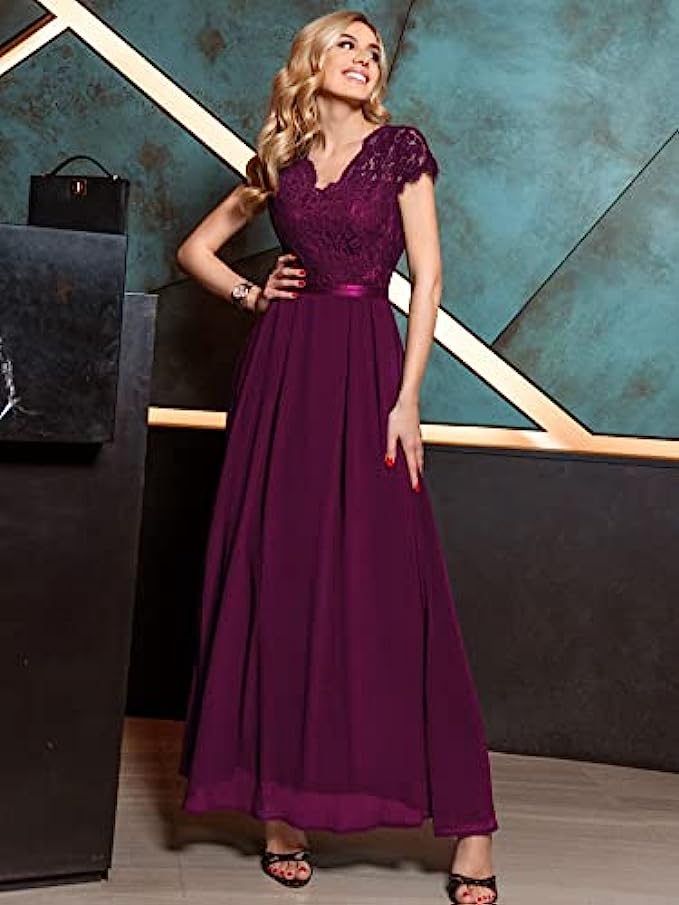 Miusol Women's Formal V Neck Elegant Floral Lace Bridesmaid Maxi Dress
