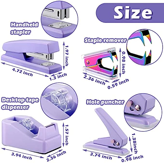 Package Includes: 1 x handheld stapler, 1 x desktop tape dispenser, 1 x hole puncher, 1000 x staples, 1 x staple remover, 1 x ballpoint pen, 74 x binder clips and paper clips, 20 x push pins, 1 x scissor, 1 x letter opener, such a complete combination is enough to meet your school and office using needs