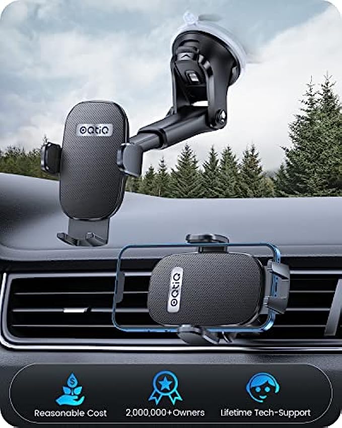 • Versatile: The OQTIQ car phone holder is an affordable, multi-functional car phone holder with an air vent clip and a suction cup that you can mount on your air vent, windshield, or dashboard. If you’re looking for a car mount that offers a little something extra, the Oqtiq phone holder is an ideal choice.