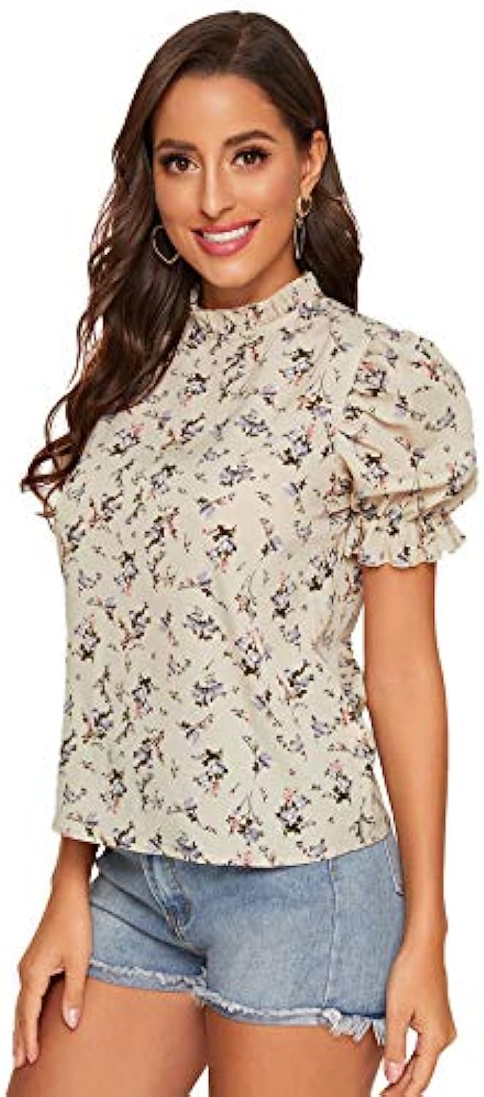 Romwe Women's Floral Print Ruffle Puff Short Sleeve Casual Blouse Tops