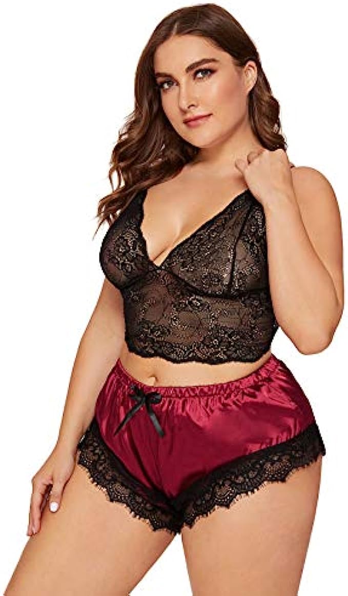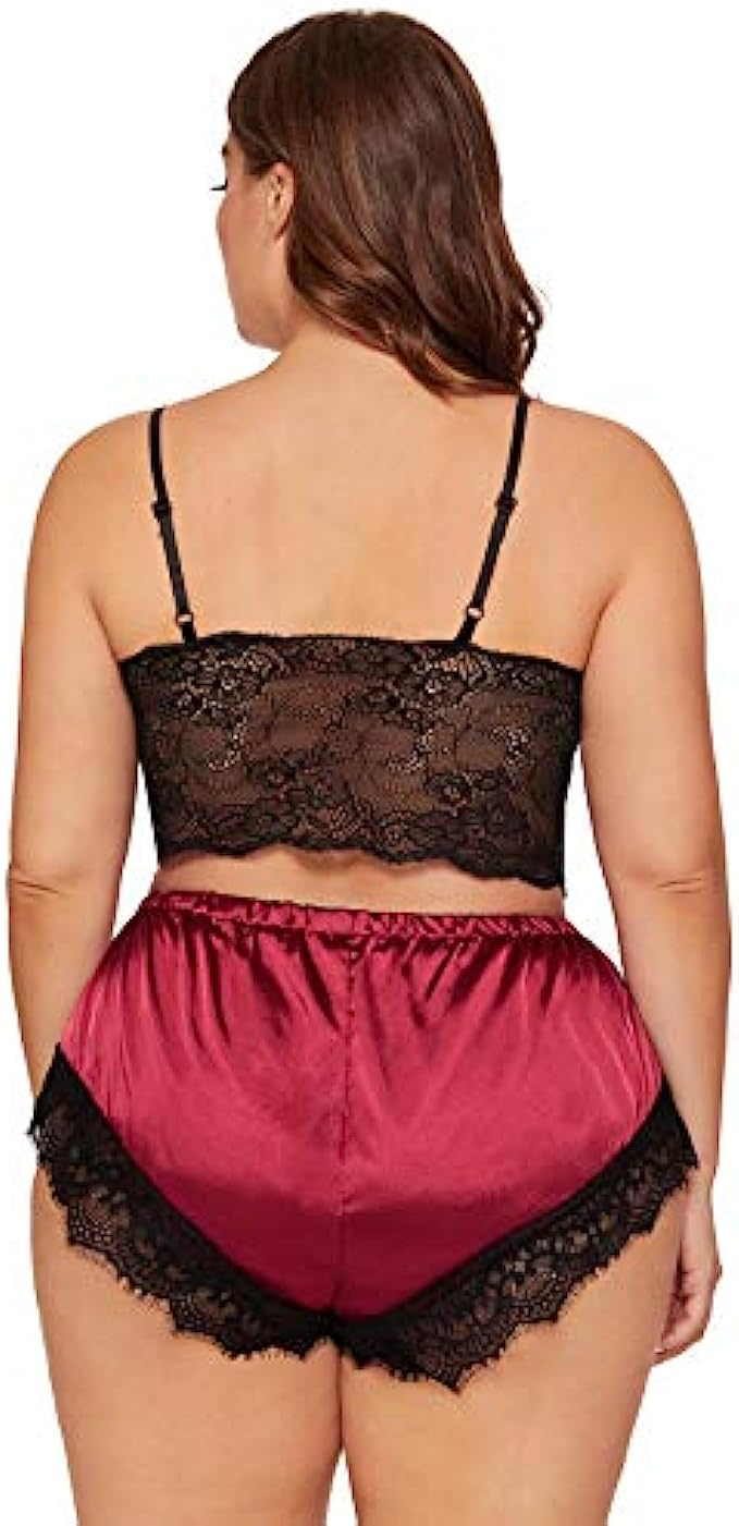 SOLY HUX Women's Plus Size Spaghetti Strap Lace Trim Bralette and Shorts Sleepwear Pajama Lingerie Set