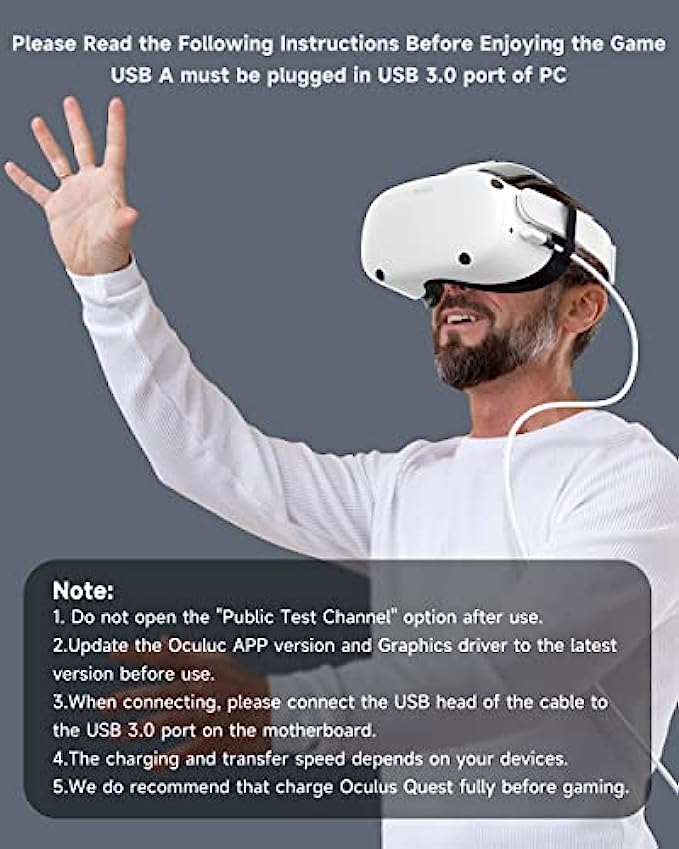 • ➤ High-Speed Transfer & Safe Charging : The USB 3.2 Gen 1 A to C link cable supports 5 Gbps data transfer, which means users won’t struggle with any lag when playing tethered VR titles, bringing you a more smooth gaming experience. Also, the USB C cable support 3A power output, letting the headset be charged while playing. Note: When connecting to your computer, please insert it into the USB A 3.1/ USB A 3.0 port.